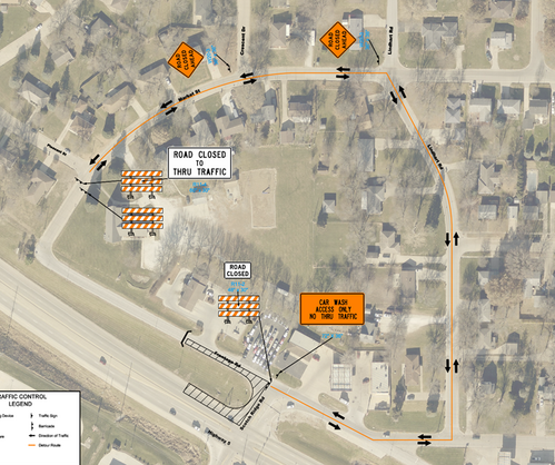 When you turn onto the frontage road, you will be forced to turn right toward Casey’s. Take a left onto Lindhard Road, then another left onto Market street. Construction could last until August 23rd.